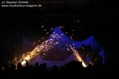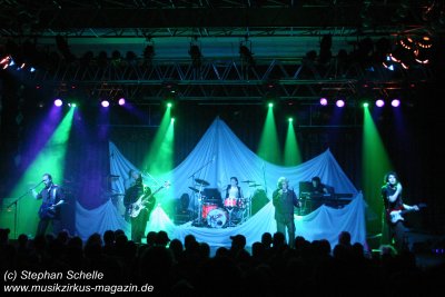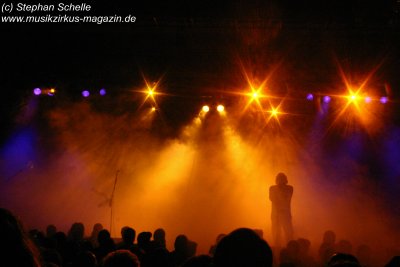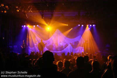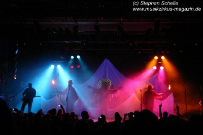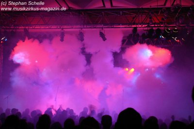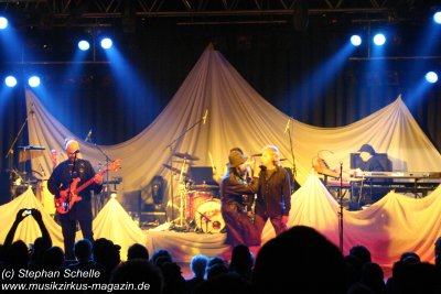 Ganz vorn standen die nochmals verbesserten Showelemente. Das Licht hatte Stefan Danielak jun. noch einmal neu programmiert, was sich wirklich gelohnt hat, denn die Lichteffekte, verbunden mit dem Nebeleinsatz waren atemberaubend und hypnotisierten die Zuschauer. Musikalisch hatten sie auch etwas Hand an einigen Stellen angelegt, denn zum einen klangen die Stücke und die Soli perfekter (nicht steril sondern noch sauberer gespielt), vor allem Tattvas Einlagen waren bisher die besten der Tour, zum anderen hat die Band das Stück „Komm und tanz“ umarrangiert. Das Stück, mit dem sie den zweiten Teil der Konzerte beginnen, klang rockiger und direkter. Das lag vor allem daran, dass die Keyboardpassagen etwas entschlackt wurden und, wie ich finde, der Bass von Milla noch druckvoller und ausgeprägter rüber kam. Auch „Solar Music“ spielten sie an diesem Abend sehr rockig. Ich hatte das Gefühl, als sei vor allem der Dialog der beiden Schlagwerker Rolf Möller und Demian Hache noch druckvoller und lebendiger gewesen.