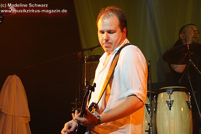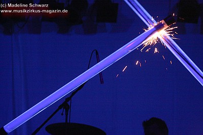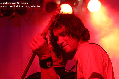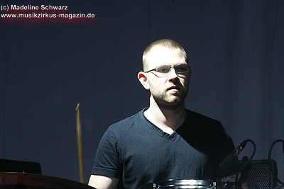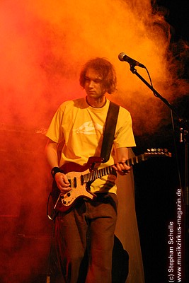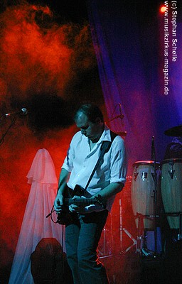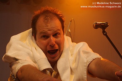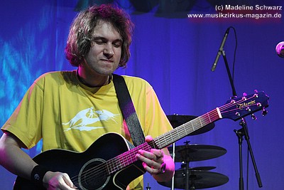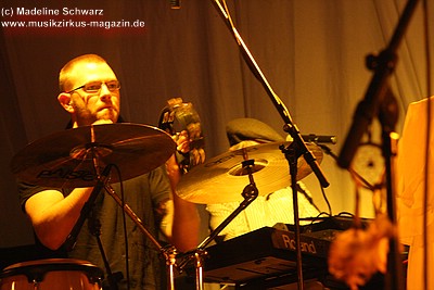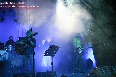 War die Band im Monat zuvor beim Auftritt in Betzdorf von gesundheitlichen und technischen Pannen ein wenig gebeutelt gewesen, legten sie hier nun einen durch und durch mitreißenden Rockevent hin. Das Zusammenspiel der Musiker ist dicht, wirkt wie aus einem Guss - die Gitarristen Nuki Danielak und Manu Kapolke werfen sich die Motive scheinbar mühelos zu, Willi Wildschwein-Danielaks Stimme und Laminatklampfe bilden ein festes Fundament, das Story und Komposition zu jedem Moment zusammenhält. Tatti Tattva an den Keys rollt elegische Klangteppiche aus oder webt feinste Soundmotive ein, während Milla Kapolkes Bass zugleich die Rhythmik vorantreibt aber auch melodisch-solistische Akzente setzt. Die beiden Schlagwerker der Gruppe scheinen nahezu jeden vertrackten Break intravenös zu sich genommen zu haben - anders ist die traumwandlerische Sicherheit kaum zu erklären, mit der Demian Hache und Admiral Top Sahne das vielschichtige Werk von Höhepunkt zu Höhepunkt trommeln. Gerade die leisen Töne zeigen, wie feinfühlig man die Drums einsetzen kann - fast schon als zusätzliches Melodieinstrument. Klar können die beiden Rhythmusleute auch powertechnisch abrocken - aber dafür ist vor allem die zweite Konzerthälfte da. Doch noch befinden wir uns im Reich poetischer Rockfantasie - und hier spielt auch Toni Moff Mollo, neben seinen charakteristischen Vocals, sein Talent als Showmensch an den Lichtreglern voll aus.