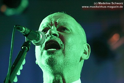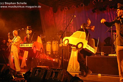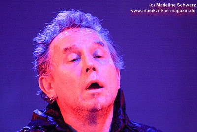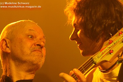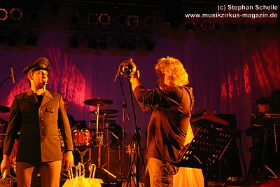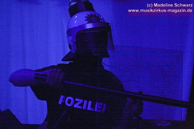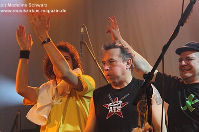 War der erste Teil des Abends eher was zum Zuhören und Träumen, lautet das Motto nun: es darf gerockt werden! Knackig und laut, mit brachialen Powerchords knallt „Razzia“, gefolgt von „Illegal“ ungestüm in den Abend. Die zwei Politkracher um polizeiliche und staatliche Willkür, optisch umgesetzt mit blaulichtbewehrten Helmträgern, die , Schilder und Knüppel im harten Stiefeltakt gegeneinander schlagen, umtost von Sirenenklängen, sind mitreißende Statements, die leider seit ihrer Entstehung nichts an Aktualität verloren haben. Danach erklingt „Vater Schmidts Wandertag“, wieder eine Reminiszenz an die 70er Jahre - ein Stück, das Publikum und Band gleichermaßen lieben, was aus jeder gespielten Note ebenso herauszuhören ist wie aus den Mitsingchorälen der Fans - die Geschichte der Familie, die zwecks Rekreation einen Plastikwald aufsucht, wird beängstigenderweise immer weniger Science Fiction - und da kann man dann nur noch eines dazu sagen: „Wir wollen leben“ - die Demohymne der Band, in Tagen von Waldabholzungen und Kernkraftkatastrophen ein wichtiges Stück Popkultur. Das Lied rockt heute stärker als früher, an Stelle von Synthielinien sind treibende Gitarrenriffs getreten, der Rhythmus powert stärker - das Stück wurde härter für härtere Zeiten.