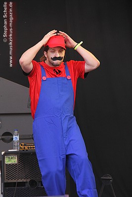 Komparse im Outfit von Super Mario (bekannt aus zahlreichen Computerspielen