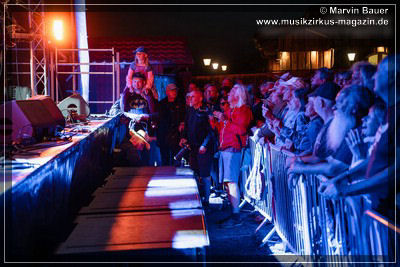 Security am Bühnenrand einem Vater mit Kind auf den Schultern sogar einen