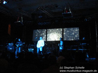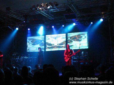 Dann ging es los. Aus den Boxen ertönte ein tiefer Bass und es wurden - zum Schrecken so manches Fans - Technorhythmen vernommen. Zu diesem fetten Sound erstrahlten die ersten Bilder auf den drei Projektionsleinwänden und zeigten ein IQ-Logo. Was ist denn jetzt los? dachte sich wohl so mancher. Aber das gehörte mit zu der guten Show. Die Musiker betraten die Bühne und von dem technoartigen Sound, der vom Band kam, ging es dann nahtlos in die Livemusik der bekannten IQ-Stücke über.