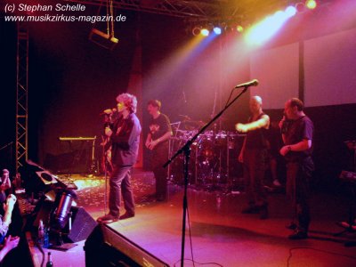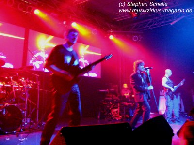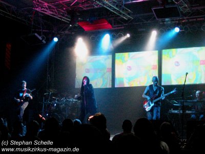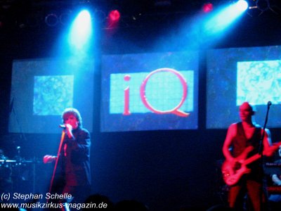 Die Band wirkte während ihres Auftrittes ein wenig statisch. Ich wünsche ihr, dass sie noch oft die Möglichkeit zu Auftritten haben, dann wird sich auch die Lockerheit einstellen. Das vorhandene Potenzial war nämlich eindeutig zu erkennen. Nach einer angemessenen Umbaupause, in der man sich auch am Merchandisingstand von IQ mit CDs und T-Shirts bestücken konnte, oder den Durst in jeglicher Form stillen konnte, ging es dann gegen ca. 21.15 Uhr mit dem Hauptact los. War schon bei Cromwell der Saal ordentlich gefüllt (man hatte aber genügend Platz), so füllte sich nun die Örtlichkeit doch merklich, obwohl ich denke, dass das Konzert nicht ausverkauft war. Ähnlich wie zu guten alten Grobschnitt-Zeiten begannen IQ mit einem kurzen Vorprogramm. Während die Bühne noch abgedunkelt war und die Band noch hinter dem Vorhang verweilte, waren die irrwitzigsten Geräusche zu hören. Da kreischte eine Katze, dann wurde gerülpst, es ertönte eine Maschinengewehrsalve und so ging es munter weiter. Wie mir ein Kumpel erzählte, der IQ schon oft live erlebt hat, ist das immer so bei ihren Auftritten.