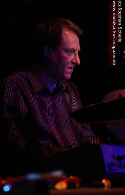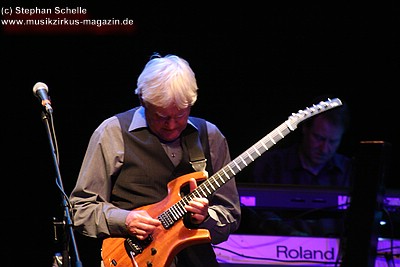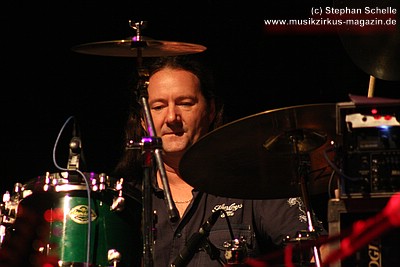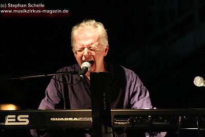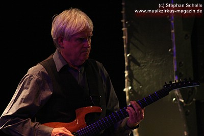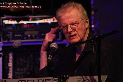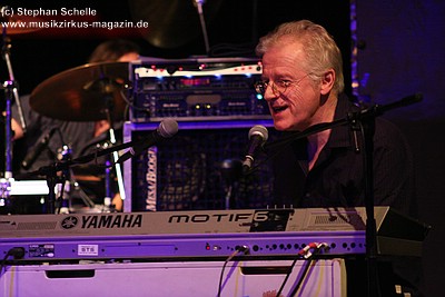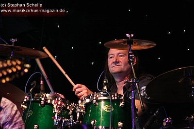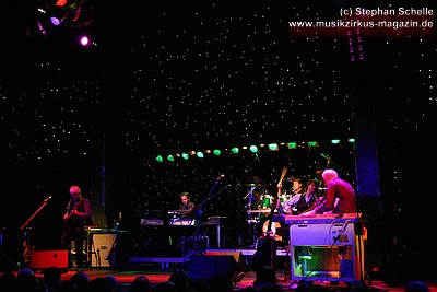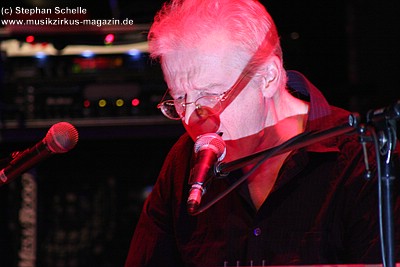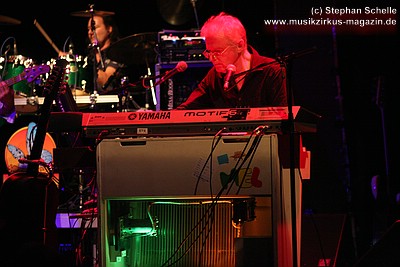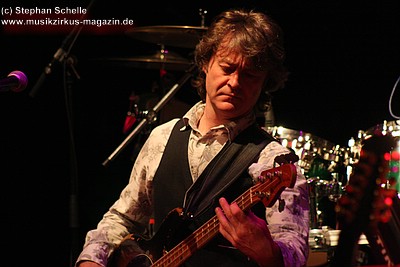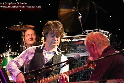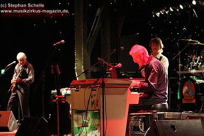 „Wolly“ spielte u. a. auf einem weißen Mellotron, das an der Rückseite durch eine Glasscheibe und internen Beleuchtung die Sicht auf die Bänder des Instruments zuließ. Das sah schon sehr interessant aus. Auffällig war der Schriftzug „MEL“ an dem Gerät. Nach dem Konzert antwortete „Wolly“ auf meine Frage, ob es sich dabei um die Abkürzung von Mellotron oder einen Hinweis auf den 2004 verstorbenen Schlagzeuger Mel Pritchard handeln würde: „Oh, that’s a good question. It will be a mysterie“. Im nächsten Moment zeigte er dann aber noch auf sein weiteres Keyboard, auf dem in großen Lettern „Les“ zu lesen war. Ich glaube so ganz haben sie ihre langjährigen Kollegen doch nicht vergessen, was die Musiker sehr sympathisch macht.