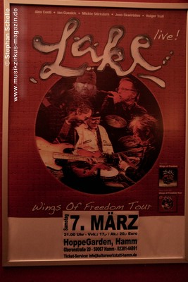 Die deutsche Rockband Lake, um ihren Gründer und Gitarristen Alex Conti, absolvierte am 07.03.2015 ihr vorletztes Konzert der „Wings Of Freedom“-Tour in der Gaststätte Hoppe Garden der Kulturwerkstatt im nordhrein-westfälischen Hamm. Zahlreiche Konzerte hat die fünfköpfige Band bereits absolviert, was man auch an der Spielfreude und dem blinden Verständnis zwischen den Musikern erkennen konnte.