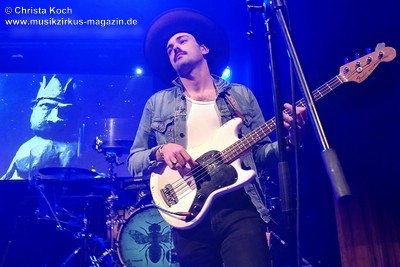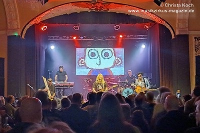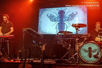 Wie bei jeder Tour von Lazuli steht das aktuellste Album immer im zentralen Fokus. Aber durch die sehr clevere Live-Präsentation hat der Besucher immer das Gefühl, dass es sich um überwiegend bekanntes Material handelt. Tatsächlich spielt Lazuli blockweise alle 12 neuen Titel von „Être Et Ne Plus Être“, sechs Fan-Favoriten und natürlich das unverwüstliche „9 Hands Around The Marimba“ zum Abschluss. Die fünf Jungs lassen sich beim leidenschaftlichen Musizieren auch diesmal wieder von extra aufwendig produzierten passenden Filmen, Bildern und Grafiken, projiziert gut sichtbar im Hintergrund, begleiten. Da Lazuli, egal wo, ihre Rock-Chansons ausschließlich in ihrer schönen Landessprache französisch singen, werden manche Inhalte dadurch visualisiert und etwas transparenter, auch wenn viele wie ich die Texte nicht verstehen, aber damit die Thematik. Auch die Soli jedes einzelnen Musikers werden dadurch unterstützt und noch eindringlicher. Lazuli: „Wir betrachten unsere Lieder als Leinwände, auf denen wir Farben mischen und die Welt darstellen oder neu malen. Irgendwo zwischen Jacques Prévert und Tim Burton angesiedelt, hinterfragen die Texte die Missstände der Gegenwart.“
