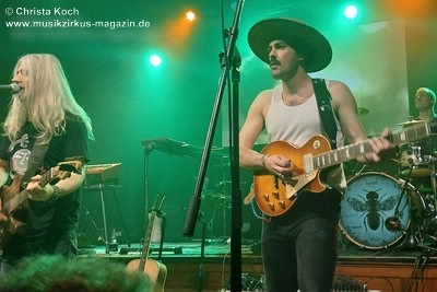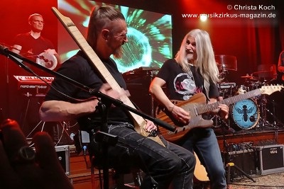 Auch ein grandioses Duett von Romain und Vince (Vibraphon) sorgt für viel Begeisterung und eben auch das Waldhorn, bei dem Romain regelmäßig kurz vorm Platzen der Halsschlagader ist und der Kopf wie eine Tomate aussieht besonders bei seinem beeindruckendem Solo am Bühnenrand. Arnaud ist inzwischen nicht nur der Auswechselspieler vom während der Pandemie ausgestiegenen Warr-Gitarristen und Sympathieträger Gédéric Byar, nein, er ist nun der sechste Musiker bei Lazuli.