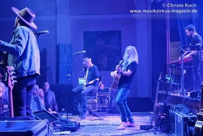 Nicht nur, dass sich diese Spielstätte mit Nebenräumen von seiner schönsten Seite zeigt. Ein zauberhafter, renovierter Jugendstil-Saal mit angrenzendem durch beeindruckenden Säulen und Bögen abgeteilten „Wintergarten“ und der bei einer auch bei gut besuchten Veranstaltungen selbst den kleinsten Zuschauern (wie mich mit 161,5 cm) immer eine ausgezeichnete Sicht auf die Bühne ermöglicht. Es sind wieder aus allen Himmelsrichtungen die Fans angereist, unser musikbegeisterter Freund Tom kam extra aus Würzburg um seine französischen Freunde hier in diesem besonderen Ambiente zu sehen. Eine Meute um mich herum bildete einen Fanblock mit einheitlichen Lazuli T-Shirts. Sie sind vollends begeistert, wieder dabei zu sein und tauschten sich über ihre mit Lazuli erlebten Heldentaten aus.