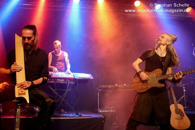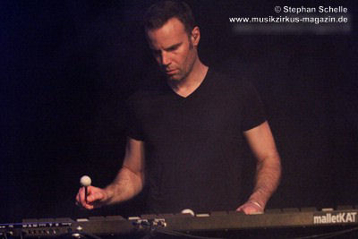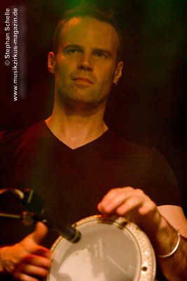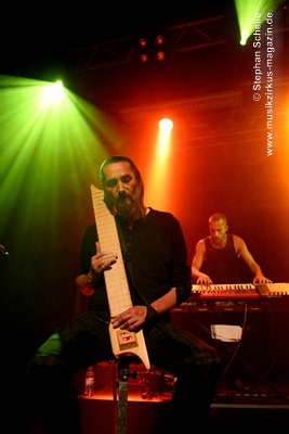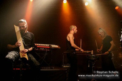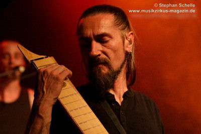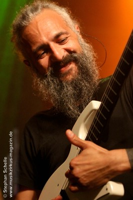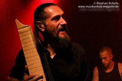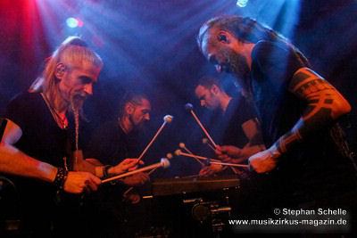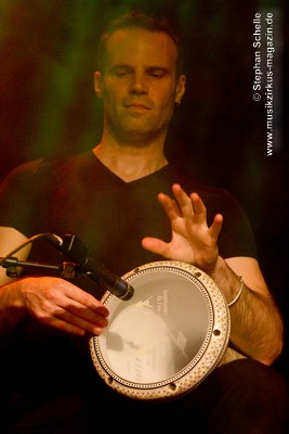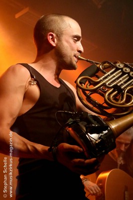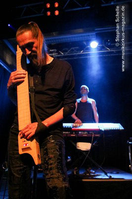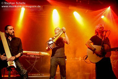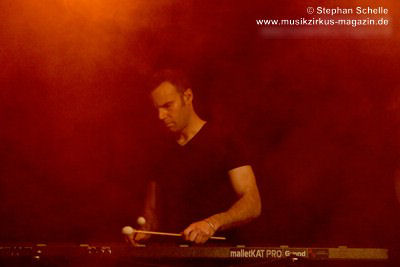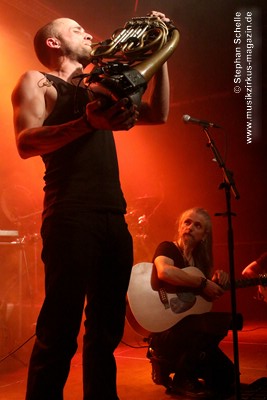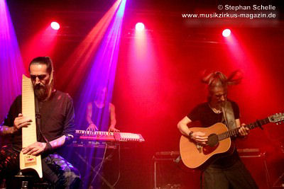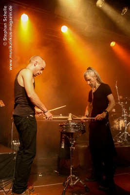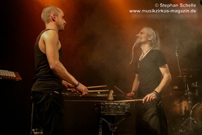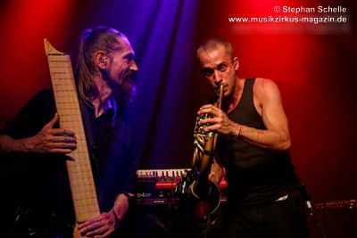 In einem Stück stellten sich Dominique und Romain an eine Snaredrum die sie mitten auf der Bühne platzierten und spielten sie gemeinsam um so den Druck des Schlagzeuges noch zu erhöhen. Das war nicht nur musikalisch sondern auch visuell ein echter Höhepunkt. Auch an ihren Instrumenten brillierten die Fünf. Wenn Romain das French Horn spielte, das er durch ein elektronisches Gerät verfremden konnte, holte er beispielsweise die unglaublichsten Sounds aus diesem Instrument heraus. Mal klang sein Blasinstrument nach einem Didgeridoo, im nächsten Moment klang es nach einem Horn und wenig später völlig anders. Dabei unterstützte er den Sound von Lazuli vor allem in den Passagen, in denen ein leicht arabisches Flair mit eingebaut wurde. Cédéric wirbelte währenddessen auf den Saiten seiner E-Gitarre oder bearbeitete sie mit einer gerade von ihm ausgetrunkenen Bierflasche (das nenne ich direkte Bottleneck-Technik). Und auch Claude zauberte wieder tolle Klänge aus seiner Leode, während Dominique wie ein Derwisch über die Bühne huschte. Bei einem Stück stieg Dominique dann von der Bühne und spielte direkt davor zwischen den Zuschauern weiter.
