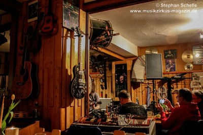 Musikfreunde in einem gemütlichen Ambiente, dessen Wände mit zahlreichen