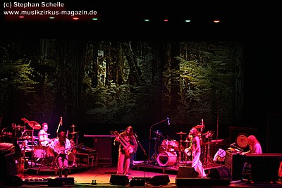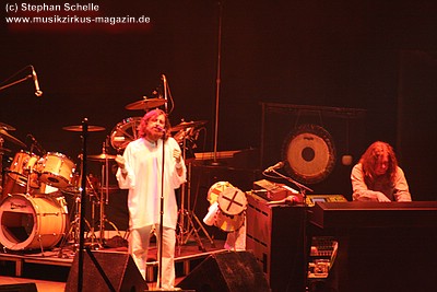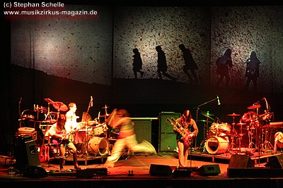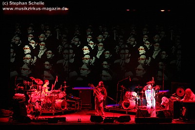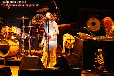 Das sechste und letzte Deutschlandkonzert während dieser Europatournee bestritten die aus Kanada stammenden The Musical Box am 27.10.2008 in der Essener Grugahalle, die ja schon so einige Rockhighlights erleben durfte, man erinnere sich nur an die legendären Rockpalastnächte. Nun kommt mit The Musical Box ein weiteres Highlight hinzu, denn die sechs Musiker David Myers (als Tony Banks), Gregg Bendian (als Bill Bruford), François Gagnon (als Steve Hackett), Sébastien Lamothe (als Michael Rutherford) und die beiden Denis Gagné und Marc Laflamme (als Phil Collins) entführten die Zuschauer durch einen musikalisch und optischen Zeitsprung in die 70’er zurück. Ursprünglich sollte den Phil Collins-Part Ron Belgard übernehmen, doch wenige Wochen vor der Tour wurde bekannt, dass er nicht mehr zur Band gehört. Aus diesem Grund sprangen Denis (Gesang) und Marc (Schlagzeug-Part) ein. Die beiden haben sich optisch aufeinander abgestimmt (beide sind für die Show mit einem wuschigen Bart und lange Haaren, wie Phil sie damals trug, ausgestattet), so dass sie ab der fünften oder sechsten Reihe nicht voneinander zu unterscheiden sind. Auch wechseln sie sich geschickt ab, so dass die Arbeitsteilung nicht gleich auffällt und die Illusion eines singenden und Schlagzeugspielenden Phil Collins hervorragend rüber kommt.