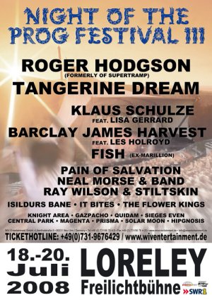 Es spielten am Freitag, den 18.07.2008: Solar Moon (Deutschland) Hipgnosis (Polen) Isildurs Bane (Schweden) Tangerine Dream (Deutschland) Klaus Schulze feat. Lisa Gerrard (Deutschland) Es spielten am Samstag, den 19.07.2008: Central Park (Deutschland) Magenta (Wales) Prisma (Schweiz) It Bites (Großbritannien) The Flower Kings (Schweden) Pain Of Salvation (Schweden) Barcley James Harvest feat. Les Holroyd (Großbritannien) Fish (Schottland) Und am Sonntag, den 20.07.2008 waren zu sehen und zu hören: Knight Area (Niederlande) Gazpacho (Norwegen) Quidam (Polen) Neal Morse & Band (USA) Ray Wilson & Stiltskin (Großbritannien) Roger Hodgson (Großbritannien) |