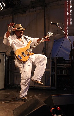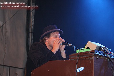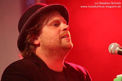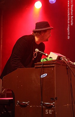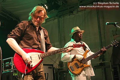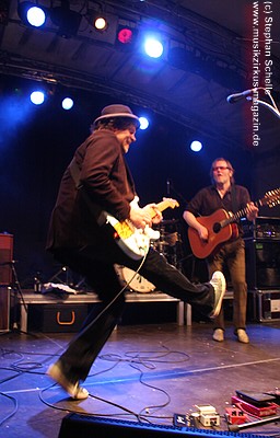 Und auch die Show des Quartetts überzeugte voll und ganz. So präsentierte sich Stefan Stoppok gelöst und spielfreudig auf der Bühne, während Reggie als verlässlicher Rhythmusgeber agierte. Schlagzeuger Benny Greb sorgte neben seinem mitreißenden Solo auch mit vielen akzentuiert oder auch druckvoll gespielte Rhythmen für den weiteren Unterbau der Songs. Und Sebastian wechselte oftmals zwischen seiner Hammond und der E-Gitarre. Ihm war ebenfalls der Spaß anzusehen, den er bei seinem Auftritt hatte. Das gipfelte dann am Ende in einer Nummer, in der er wie AC/DC’s Angus Young einbeinig über die Bühne hüpfte, was zu Szenenapplaus führte. Und in den bluesigen Passagen, in denen Stefan Stoppok zu Soli ansetzte ging er ganz schön an der Gitarre ab.
