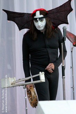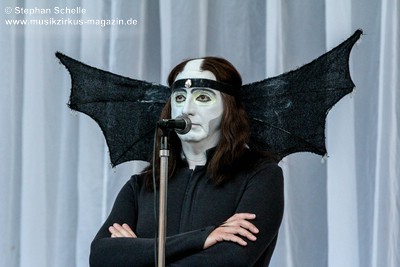 Fledermausflügeln am Kopf, einer Perücke, die die rasierte Stirn