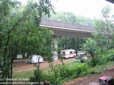 Meinen Schätzungen zu Folge mögen ca. 400 Besucher unter Brücke gewesen sein. Viele wird vor allem der doch erhebliche Temperatursturz und der beginnende Regen an dem Wochenende vor einem Besuch abgeschreckt haben. Das war aber völlig unbegründet. Neben der Stage waren mehrere Getränkestände sowie Stände mit T-Shirts, Schals, Räucherstäbchen etc. aufgebaut. Das verbreitete schon ein gewisses Flair. Auch Campen konnte man direkt unter der Brücke. Davon machten auch einige Gebrauch. Es qualmten an einigen Stellen die Lagerfeuer derer, die ein Musikwochenende einmal in ganz anderer Atmosphäre erleben wollten. Die Konzerte der Bands findet ihr unter den u. a. Links: