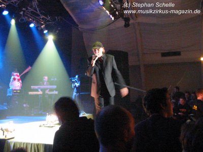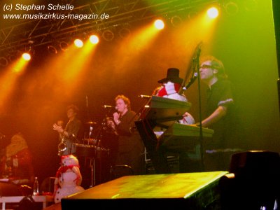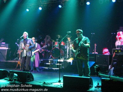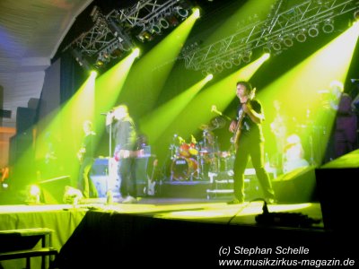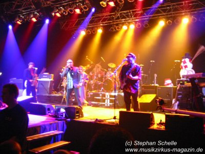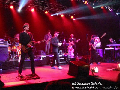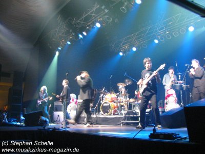 Reiner Hänsch und auch die anderen Mitglieder der Band waren gut gelaunt und das spürte man an Gesten, der Spielfreude und an den lockern Sprüchen, die Reiner zwischen den Stücken zum Besten gab. Oft hatte er eine kleine Geschichte zu erzählen. Auch mischte er sich wieder unters Publikum und ging bis zur Saalmitte in die Besuchermassen hinein. Wieder auf der Bühne zog er einen roten Sack hervor und schmiss einige kleine Geschenke in die Menge (Autogrammkarten, Walnüsse - womit die wohl gefüllt waren?- , etc). Gut gefiel mir die durch eine Art Laufsteg erweiterte Bühne. Hiervon machten die Musiker - allen voran natürlich Reiner und seine Sängerin - oft Gebrauch. Das brachte die Band so richtig in die Nähe der Fans, die das begeistert aufnahmen. Die nächsten Stücke brachten die Zuschauer dann wieder dazu zu tanzen und zu singen. Kein Leben, Hundertmark und Gimme Gummi sorgten für gute Stimmung. Dann war nach fast zwei Stunden der offizielle Teil der Show, die übrigens durch eine sehr ansprechende Lightshow unterstützt wurde, beendet.
