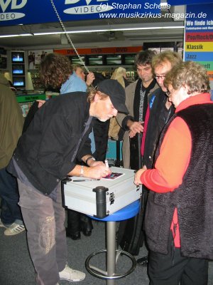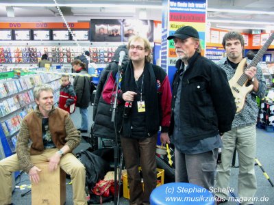Kurz vor 17.00 Uhr legten die Musiker, die bis auf den Saxophonisten komplett waren, im Ladenlokal eine Unplugged Session auf’s Parkett. Neben drei Akustikgitarren, Gesang, Perkussion war als einziges elektronisches Instrument ein Bass dabei. Der Schlagzeuger, Wolf Simon, spielte auf einer Art Kiste von Cajon, auf der er den Rhythmus bestimmte, während Keyboarder Reiner Burmann ein weiteres Perkussioninstrument bearbeitete.