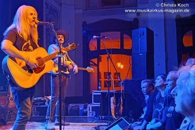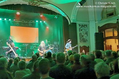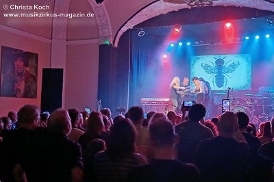 Nicht nur, dass sich diese Spielstätte mit Nebenräumen von seiner schönsten Seite zeigt. Ein zauberhafter, renovierter Jugendstil-Saal mit angrenzendem durch beeindruckenden Säulen und Bögen abgeteilten „Wintergarten“ und der bei einer auch bei gut besuchten Veranstaltungen selbst den kleinsten Zuschauern (wie mich mit 161,5 cm) immer eine ausgezeichnete Sicht auf die Bühne ermöglicht. Es sind wieder aus allen Himmelsrichtungen die Fans angereist, unser musikbegeisterter Freund Tom kam extra aus Würzburg um seine französischen Freunde hier in diesem besonderen Ambiente zu sehen. Eine Meute um mich herum bildete einen Fanblock mit einheitlichen Lazuli T-Shirts. Sie sind vollends begeistert, wieder dabei zu sein und tauschten sich über ihre mit Lazuli erlebten Heldentaten aus.