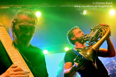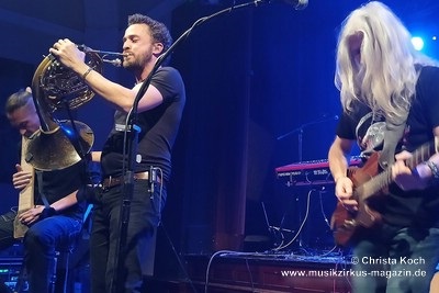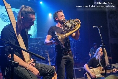 Auch ein grandioses Duett von Romain und Vince (Vibraphon) sorgt für viel Begeisterung und eben auch das Waldhorn, bei dem Romain regelmäßig kurz vorm Platzen der Halsschlagader ist und der Kopf wie eine Tomate aussieht besonders bei seinem beeindruckendem Solo am Bühnenrand. Arnaud ist inzwischen nicht nur der Auswechselspieler vom während der Pandemie ausgestiegenen Warr-Gitarristen und Sympathieträger Gédéric Byar, nein, er ist nun der sechste Musiker bei Lazuli.