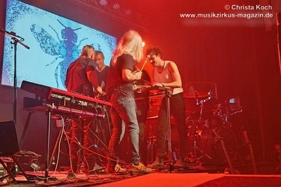 Wie bei jeder Tour von Lazuli steht das aktuellste Album immer im zentralen Fokus. Aber durch die sehr clevere Live-Präsentation hat der Besucher immer das Gefühl, dass es sich um überwiegend bekanntes Material handelt. Tatsächlich spielt Lazuli blockweise alle 12 neuen Titel von „Être Et Ne Plus Être“, sechs Fan-Favoriten und natürlich das unverwüstliche „9 Hands Around The Marimba“ zum Abschluss. Die fünf Jungs lassen sich beim leidenschaftlichen Musizieren auch diesmal wieder von extra aufwendig produzierten passenden Filmen, Bildern und Grafiken, projiziert gut sichtbar im Hintergrund, begleiten. Da Lazuli, egal wo, ihre Rock-Chansons ausschließlich in ihrer schönen Landessprache französisch singen, werden manche Inhalte dadurch visualisiert und etwas transparenter, auch wenn viele wie ich die Texte nicht verstehen, aber damit die Thematik. Auch die Soli jedes einzelnen Musikers werden dadurch unterstützt und noch eindringlicher. Lazuli: „Wir betrachten unsere Lieder als Leinwände, auf denen wir Farben mischen und die Welt darstellen oder neu malen. Irgendwo zwischen Jacques Prévert und Tim Burton angesiedelt, hinterfragen die Texte die Missstände der Gegenwart.“